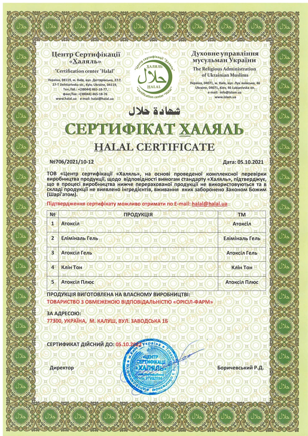 Виробництво, на якому виготовлений Eliminal gel®, має сертифікати якості міжнародного зразка: GMP, HACCP, ISO 2200.